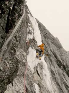 Описание маршрута - сухие цифры: перепад высот - 1254 м (по альтиметру), протяженность маршрута: 1485 м, протяженность участков: V кат. сл. - 385 м, VI кат. сл. - 350 м. Средняя крутизна основной части маршрута - 76°, всего маршрута - 70°. Сколько использовано крючьев на маршруте, ледобуров, закладных элементов, сколько искусственных точек опоры... Конечно, это интересно специалистам.