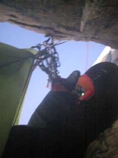 Об установке палатки мы даже не мечтали. Нам удалось вырубить наклонную площадку размером 30х40 сантиметров. Для второго человека натянули перила под карнизом. В эти перила повесили рюкзак, чтобы в нем можно было хотя бы сидеть. На перила повесили тент от палатки, чтобы не так дуло. Сначала было комфортно. Так я провел ночь - сидя в рюкзаке под карнизом скалы. Внизу была ледяная пропасть. Я проваливался в сон, вращаясь вокруг своей оси. Спустя пару часов начали неметь ноги, а потом и все тело. В общем, всю ночь искали лучшие варианты для сна. В итоге срубили полочку около 20 сантиметров. Мы пытались там сидеть, висеть, подвисать... Как только стало сереть, начали собирать вещи, чтобы идти дальше. И тут обнаружили, что у нас улетела газовая горелка. Хорошо, что была запасная. Растопили снег, забросили кофе «три в одном» в холодную воду (решили на всякий случай экономить газ), и начали работать.